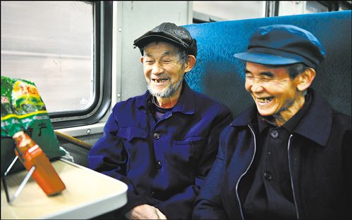 在7270次列車上,湖南省靖州苗族侗族自治縣的汪家(右)與楊永燦,在行駛的列車車廂里開心地觀看“小電視”。