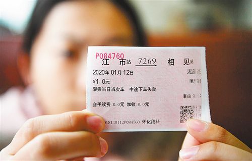 ▲江市站開往相見站的7269次列車上,一名旅客展示自己的車票,票價只有1元。列車最高票價11元。