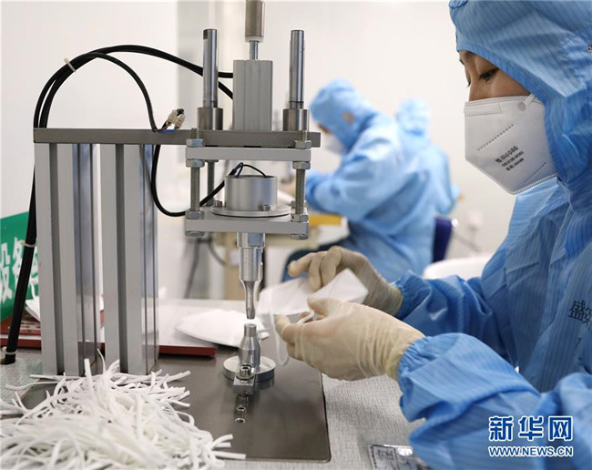 沈陽(yáng)盛實(shí)醫(yī)療科技有限公司工人在為醫(yī)用防護(hù)級(jí)N95口罩焊接耳套(2月8日攝)。 新華社記者 姚劍鋒 攝