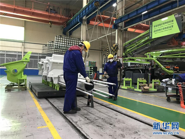2月7日,中聯(lián)重科混凝土泵送機(jī)械分公司工人在廠房?jī)?nèi)裝配拖泵產(chǎn)品。 新華社發(fā)