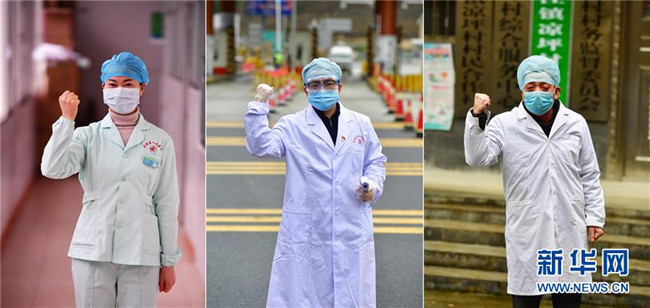 參與防疫工作的粟萬(wàn)龍(中)、楊紅英(左)夫妻和哥哥粟從軍(拼版照片,2月8日攝)。