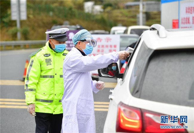 在廣西龍勝各族自治縣高速公路收費(fèi)站出口,粟萬(wàn)龍(右)對(duì)過(guò)往人員進(jìn)行體溫檢測(cè)(2月8日攝)。