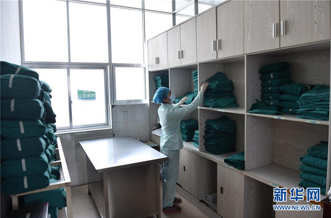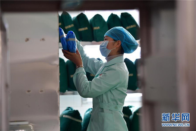 在廣西龍勝各族自治縣人民醫(yī)院,粟萬(wàn)龍的妻子楊紅英在整理醫(yī)療物資(2月8日攝)。
