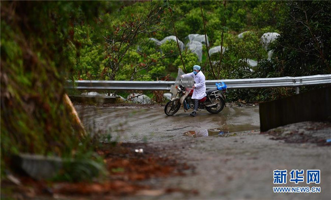 在廣西龍勝各族自治縣樂(lè)江鎮(zhèn)涼坪村,粟萬(wàn)龍的哥哥粟從軍騎車上路,準(zhǔn)備發(fā)放疫情防控宣傳材料(2月8日攝)。