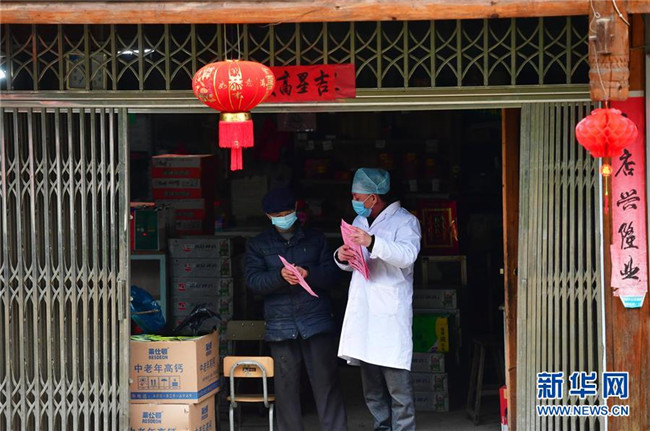 在廣西龍勝各族自治縣樂(lè)江鎮(zhèn)涼坪村,粟萬(wàn)龍的哥哥粟從軍(右)向村民發(fā)放疫情防控宣傳資料(2月8日攝)。