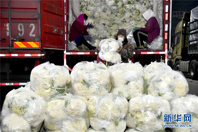 2月1日,在山東省壽光農(nóng)產(chǎn)品物流園,菜農(nóng)搬運蔬菜以保障新冠肺炎疫情防控期間蔬菜供應。新華社記者 郭緒雷 攝
