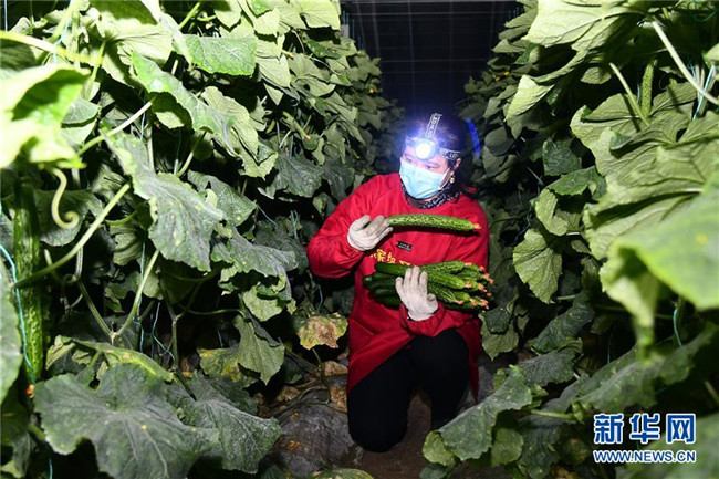 2月2日凌晨,在山東省壽光市綠圣果蔬專業(yè)合作社,菜農(nóng)桑雪梅帶著頭燈在采摘黃瓜以供應新冠肺炎疫情嚴重的武漢地區(qū)。新華社記者 郭緒雷 攝