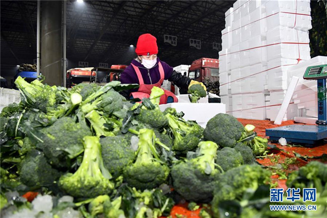 2月1日,在山東省壽光農(nóng)產(chǎn)品物流園,菜農(nóng)整理裝箱蔬菜以保障新冠肺炎疫情防控期間蔬菜供應。新華社記者 郭緒雷 攝