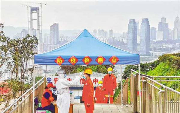 二月二十九日,在中鐵隧道三處重慶軌道交通十號線二期七星崗項目部,工人們正拉開間距排隊測量體溫后進入工地。通訊員 周勇 攝