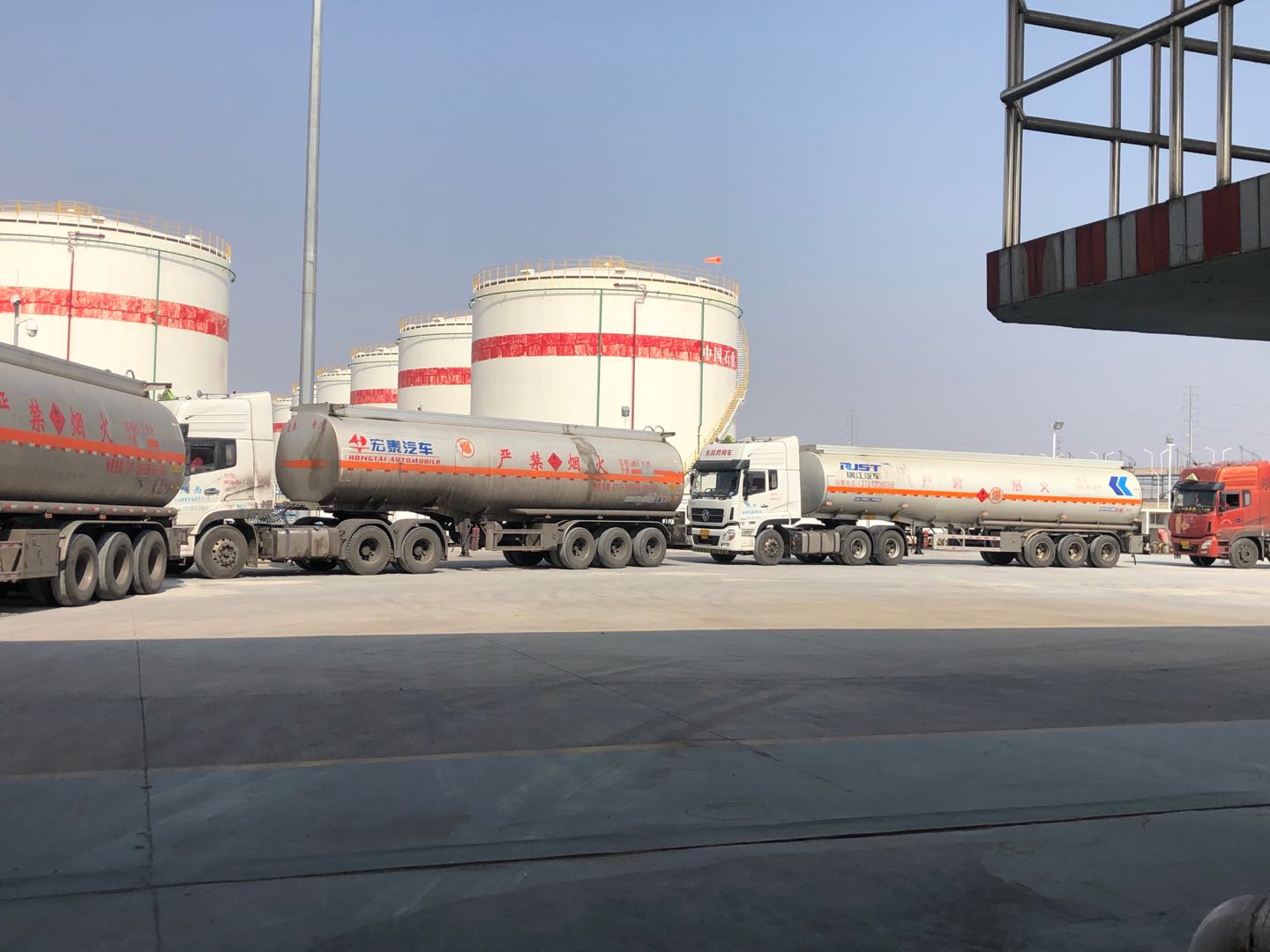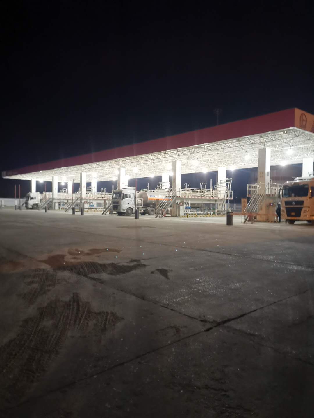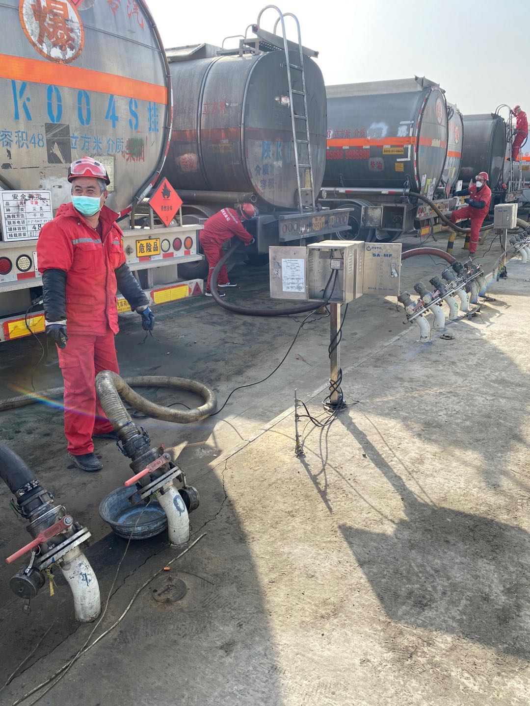 已近零時,空曠的付油區(qū)氣溫早已降至零攝氏度以下。此時,油庫的發(fā)油作業(yè)依然沒有停止……油庫的幾名工友,頭戴紅色安全帽、身著藍色工裝,對入庫油庫油車進行安全檢查,驗票員仔細核對著票據(jù)信息,引導車輛正確??浚粩嗵崾抉{駛員注意操作安全。