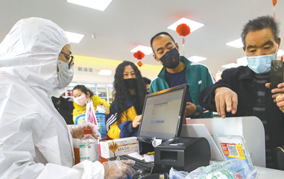 疫情期間,人們對(duì)自己的健康狀況更加關(guān)注。圖為在山東省臨沂市沂蒙路一家醫(yī)藥零售連鎖店內(nèi),消費(fèi)者正在購(gòu)買防護(hù)口罩和酒精消毒液。人民視覺