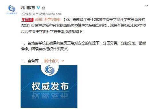 《通知》稱(chēng),經(jīng)四川省應(yīng)對(duì)新型冠狀病毒肺炎疫情應(yīng)急指揮部同意,現(xiàn)將全省各級(jí)各類(lèi)學(xué)校2020年春季學(xué)期開(kāi)學(xué)有關(guān)事項(xiàng)通知如下: