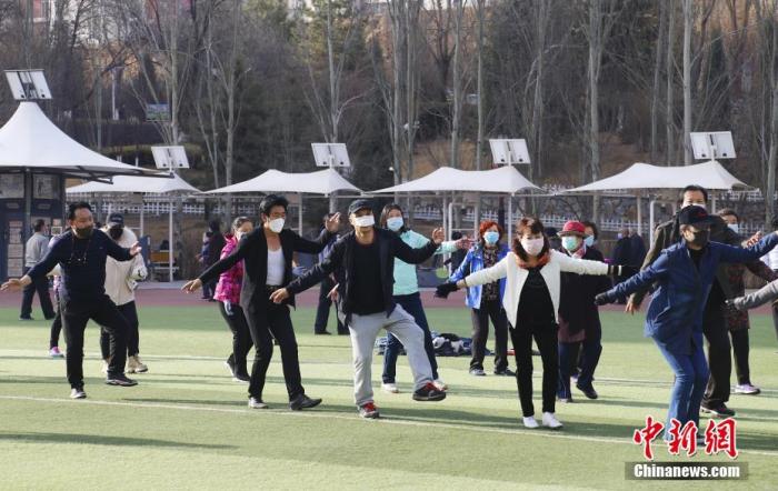 資料圖:3月20日,西寧市戶外體育場所已全部開放,市民在體育場上跳起鍋莊。 中新社記者 馬銘言 攝