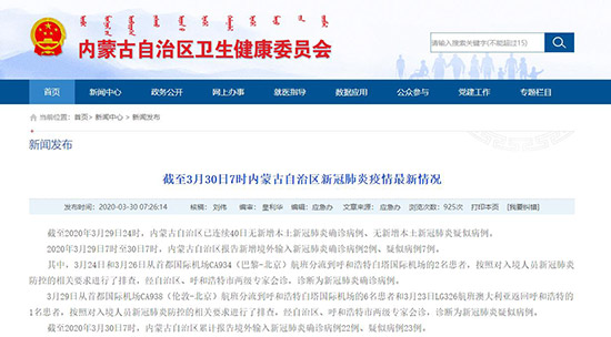 2020年3月29日7時至30日7時,內(nèi)蒙古自治區(qū)報告新增境外輸入新冠肺炎確診病例2例、疑似病例7例。