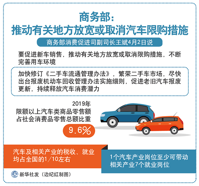 商務部消費促進司副司長王斌2日說,要促進新車銷售,推動有關地方放寬或取消限購措施,不斷完善用車環(huán)境,加快修訂《二手車流通管理辦法》,繁榮二手車市場,盡快出臺報廢機動車回收管理辦法實施細則,促進老舊汽車報廢更新,持續(xù)釋放汽車消費潛力。