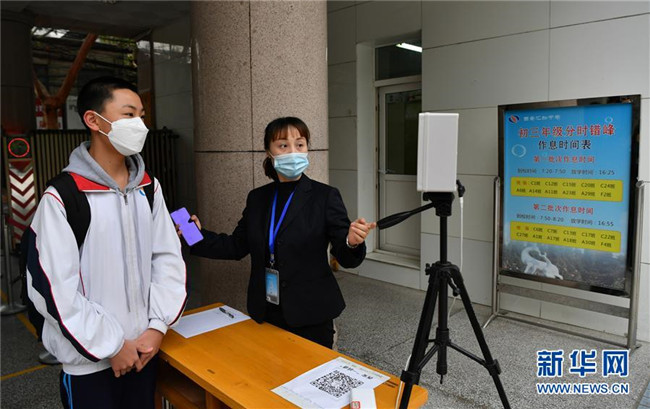 4月7日,西安匯知中學(xué)初三學(xué)生進(jìn)入校園時測量體溫。