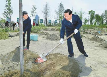 四月八日,四川省委書記彭清華到成都市調(diào)研公園城市建設(shè)推進情況。在天府中央公園,彭清華與天府新區(qū)干部群眾一起植樹造林,為公園城市建設(shè)再添一抹綠、貢獻一份力。記者 歐陽杰 攝