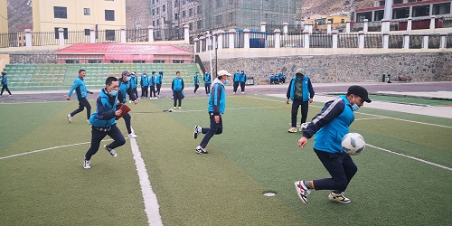 玉樹州民族中學學生在操場踢足球。 楊陽攝