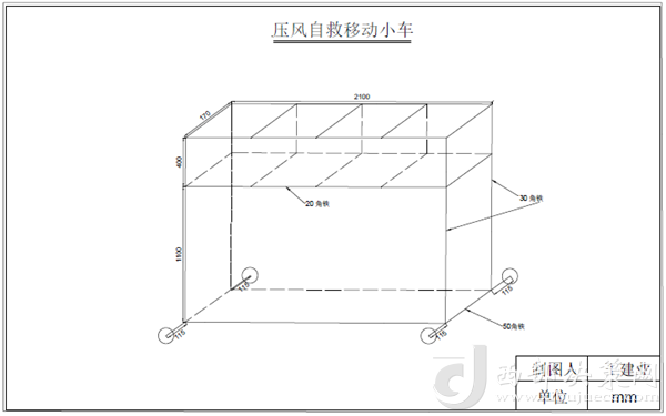 圖紙畫好后,王建業(yè)火速發(fā)給了材料員老王,老王憑借多年的人脈,在車間找來電焊師傅,又拾了廢棄的幾塊角鋼和幾個(gè)車輪,半晌就把王建業(yè)想要的東西給做了出來。其實(shí)很簡單,根據(jù)壓風(fēng)自救箱的尺寸,利用扁鐵構(gòu)建整體框架,下方安裝四個(gè)滑輪即可投入使用。