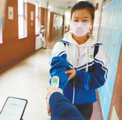 “先找到班級固定位置,根據地面標記有間隔地排隊。”寧珂菡熟練地向記者介紹,“挨個進入值班室后,面朝機器進行人臉識別,然后登記信息、測量體溫,一切正常才能入校。”