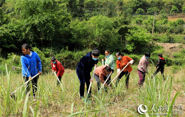 在廣西柳州市融安縣沙子鄉(xiāng)紅妙村,勞務(wù)隊(duì)成員在村集體經(jīng)濟(jì)甘蔗示范點(diǎn)勞作。譚凱興攝