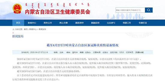 4月27日,記者從內蒙古自治區(qū)衛(wèi)生健康委員會獲悉,2020年4月26日7時至4月27日7時,內蒙古自治區(qū)報告無新增確診病例、疑似病例。治愈出院8例(均由滿洲里市口岸入境)。