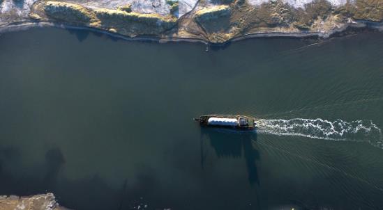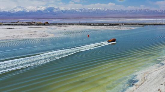 遠處人工鹵水運河上轟鳴聲陣陣,鹽湖游輪破風而來,掀起一波波潔白的浪花,在陽光的照射下金光閃爍。乘坐游船航行在鹵水人工運河上可以直觀體驗工業(yè)遺風,欣賞全機械化的船采船運,感受茶卡鹽湖鹽業(yè)開采的滄桑巨變,是“原生態(tài)的鹽湖工業(yè)活景觀”。
