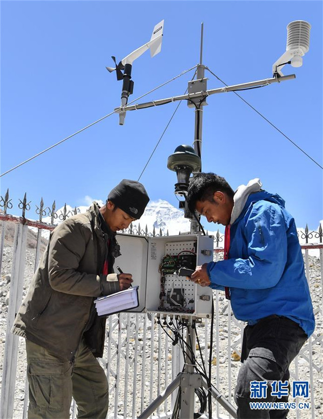 當(dāng)日,西藏自治區(qū)氣象局工作人員在珠峰大本營(yíng)的自動(dòng)氣象站校準(zhǔn)觀測(cè)儀器、比對(duì)觀測(cè)數(shù)據(jù),為2020珠峰高程測(cè)量活動(dòng)提供氣象保障。
