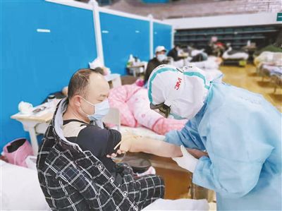 洪山體育館武昌方艙醫(yī)院是我省赴湖北護(hù)理醫(yī)療隊(duì)的主戰(zhàn)場(chǎng),我省護(hù)理醫(yī)療隊(duì)負(fù)責(zé)方艙醫(yī)院兩個(gè)病區(qū)的護(hù)理工作。由于方艙醫(yī)院是臨時(shí)搭建的,工作環(huán)境較差,醫(yī)護(hù)人員的個(gè)人防護(hù)就更為重要了。抵達(dá)疫區(qū)后,為降低護(hù)理人員感染風(fēng)險(xiǎn),正確掌握防護(hù)操作規(guī)程,領(lǐng)隊(duì)和聯(lián)絡(luò)員積極協(xié)調(diào)省內(nèi)專(zhuān)家對(duì)隊(duì)員們進(jìn)行個(gè)人穿脫防護(hù)服培訓(xùn),經(jīng)過(guò)兩天兩夜緊張而嚴(yán)格的“一對(duì)一”培訓(xùn),大家一遍遍地重復(fù)著所有的培訓(xùn)細(xì)節(jié),最終所有隊(duì)員的穿脫防護(hù)服等個(gè)人防護(hù)能力順利通過(guò)考核。同時(shí),協(xié)調(diào)省外專(zhuān)家對(duì)隊(duì)員們進(jìn)行感控知識(shí)、心理健康教育、咽拭子標(biāo)本采集培訓(xùn),并實(shí)行每4小時(shí)一班輪換制度,我省赴湖北護(hù)理醫(yī)療隊(duì)日常主要開(kāi)展院感控制、咽拭子采集、核酸檢測(cè)、拍片、靜脈采血、病人日常護(hù)理等工作。外圍人員負(fù)責(zé)對(duì)病區(qū)工作的技術(shù)指導(dǎo)、管理、外圍支持、病區(qū)物資發(fā)放、臨時(shí)抽調(diào)工作人員等。