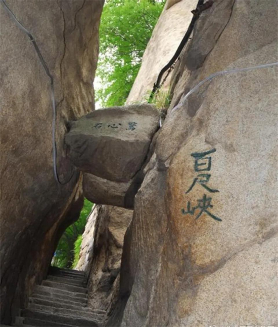 又叫“百丈崖”,兩壁欲合,卻被飛來(lái)的兩顆石塊從中撐開,分別為“驚心石”和“平心石”。人從石頭下鉆過,膽戰(zhàn)心驚又安然無(wú)恙,驚險(xiǎn)刺激。