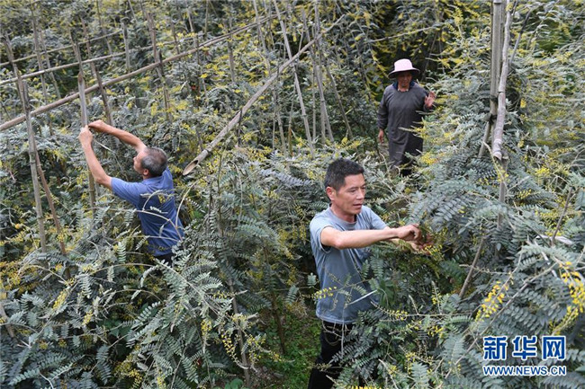 在廣西環(huán)江毛南族自治縣下南鄉(xiāng)下塘村,毛南族村民在管護(hù)種植的中草藥(5月13日攝)。
