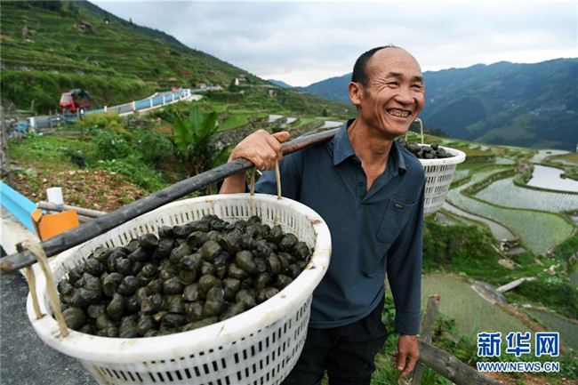 在田螺養(yǎng)殖過程中,采取“公司+合作社+農戶”的模式,政府統(tǒng)一向龍頭公司采購種螺交給合作社,合作社根據(jù)貧困戶水田規(guī)模和意愿發(fā)放種螺,同時公司技術人員入村開展養(yǎng)殖技術培訓,田螺收獲時再由合作社對接種螺公司統(tǒng)一上門按保底價回收,解除了貧困戶養(yǎng)殖和銷售的后顧之憂,進一步拓寬山區(qū)群眾脫貧增收渠道。 新華社記者 楊文斌 攝