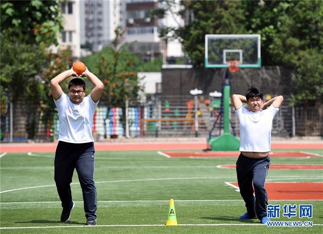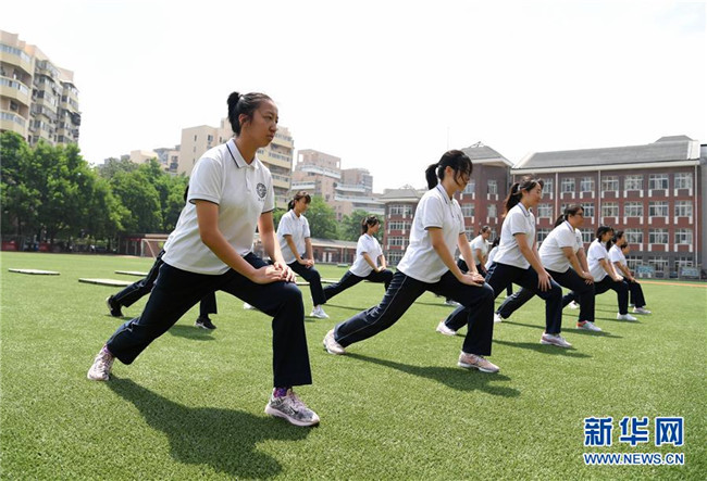 5月28日,北京市第十八中學(xué)初三年級的學(xué)生在體育課上做準備活動。新華社記者 任超 攝