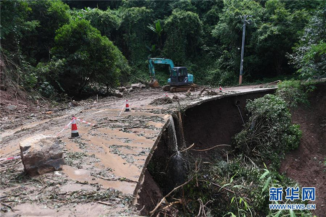 這是廣西陽朔縣普益鄉(xiāng)境內(nèi)的一處滑坡?lián)p毀道路(6月11日攝)。新華社記者 陸波岸 攝