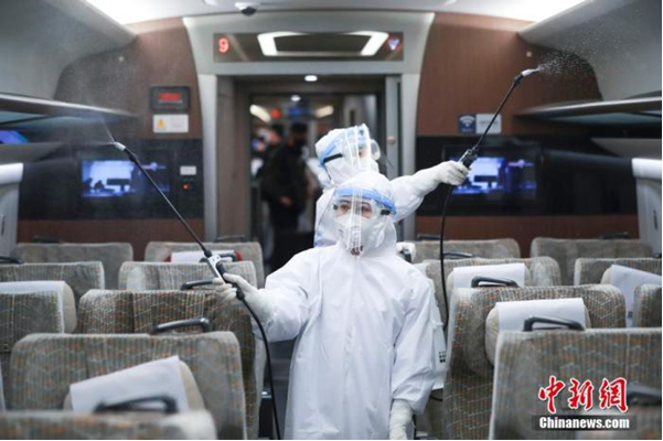 資料圖:工作人員在一輛高鐵車(chē)廂內(nèi)執(zhí)行消毒任務(wù)。中新社記者 賈天勇 攝