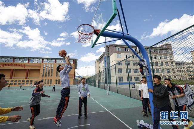 在四川省阿壩藏族羌族自治州阿壩縣藏文中學(xué)新的籃球場上,初中二年級(jí)男生在體育課上打籃球(6月14日攝),周圍則是新的教學(xué)樓和體育運(yùn)動(dòng)場館。新華社記者 沈伯韓 攝