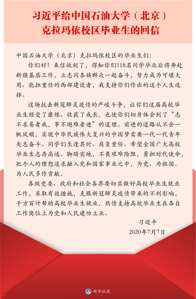 “志不求易者成,事不避難者進(jìn)”。7月7日,習(xí)近平給中國石油大學(xué)(北京)克拉瑪依校區(qū)畢業(yè)生回信,對重新起航的學(xué)子們殷殷叮囑,支持他們到邊疆基層工作的選擇,鼓勵(lì)他們克難前行,寄語廣大高校畢業(yè)生把個(gè)人的理想追求融入黨和國家事業(yè)之中。