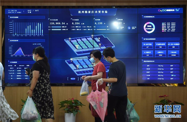 浙江省杭州市的5G農(nóng)貿(mào)市場——駱家莊農(nóng)貿(mào)市場的大屏幕上實(shí)時顯示交易、客流等相關(guān)情況(5月17日攝)。新華社記者 韓傳號 攝