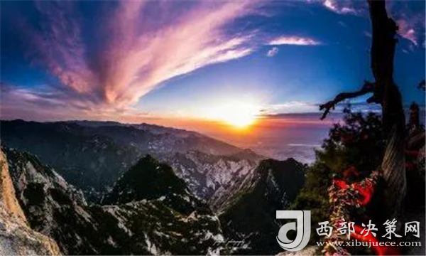 是時,但見夜幕自東方悄然隱退,晨曦初露,漸漸霞光瑰麗,云源奔涌。瞬間,一輪火球噴薄而出,繼而光芒四射,氣象萬千,整個世界大放光明,游人身心為之一振。待云霧散盡,蒼松翠柏,則更加清麗悅目,美妙神奇。故而,游名山者必登華山,登華山者必觀日。華山日出亦被列為華山自然風(fēng)光中的重要景觀之一。