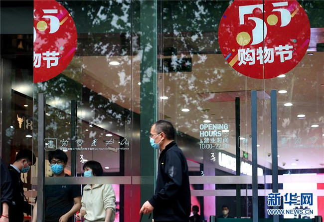 這是上海淮海路一家商場(chǎng)的“五五購(gòu)物節(jié)”標(biāo)識(shí)(5月5日攝)。5月4日晚,上海首次啟動(dòng)大規(guī)模商業(yè)促銷(xiāo)活動(dòng)“五五購(gòu)物節(jié)”,多家在線新經(jīng)濟(jì)企業(yè)參與。 新華社記者 劉穎 攝