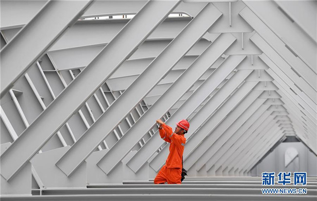 6月20日,建設(shè)者在河南孟州黃河大橋工地施工。 新華社記者 郝源 攝