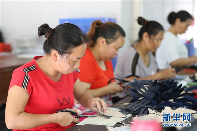 7月18日,在貴州省銅仁市玉屏侗族自治縣田坪鎮(zhèn)侗鄉(xiāng)風(fēng)情園內(nèi),易地扶貧搬遷群眾在制鞋。新華社發(fā)(胡攀學(xué) 攝)