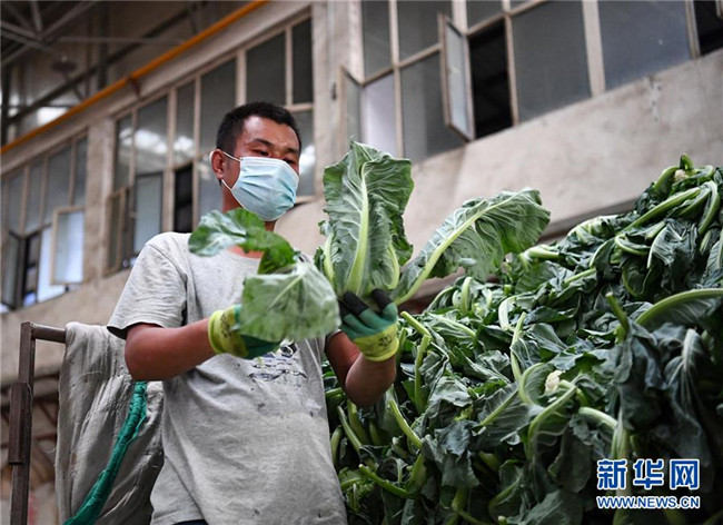 7月18日,在烏魯木齊市沙依巴克區(qū)新疆九鼎農(nóng)產(chǎn)品批發(fā)市場(chǎng),一商戶(hù)整理蔬菜。 新華社記者 宋彥樺 攝