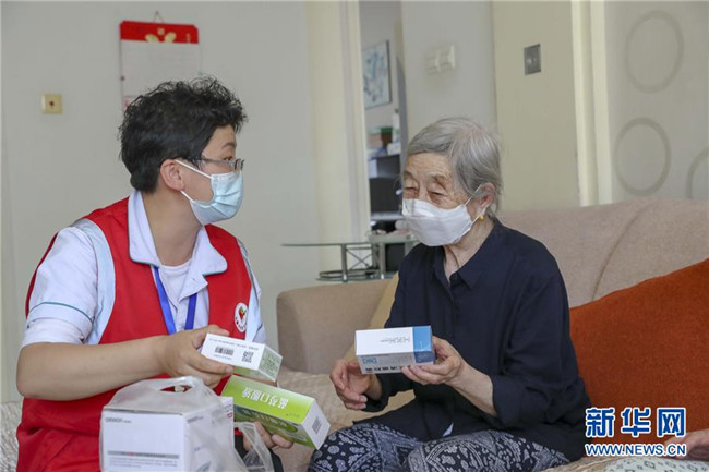 烏魯木齊市沙依巴克區(qū)騰威社區(qū)的志愿者為獨(dú)居老人送來(lái)蔬菜和常用藥品(7月18日攝)。 新華社發(fā)(陳宇 攝)