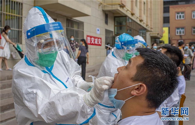 7月17日起,烏魯木齊市開(kāi)始對(duì)全市居民進(jìn)行免費(fèi)核酸檢測(cè),重點(diǎn)人群所在社區(qū)要實(shí)現(xiàn)100%檢測(cè)。家住天山區(qū)光北社區(qū)的63歲居民雷雙蘭說(shuō):“19日社區(qū)挨戶(hù)通知下樓排隊(duì)檢測(cè),大家都戴著口罩,前后保持一米安全距離,一家人幾分鐘就檢測(cè)完了。”