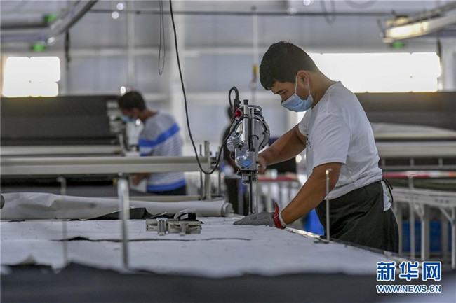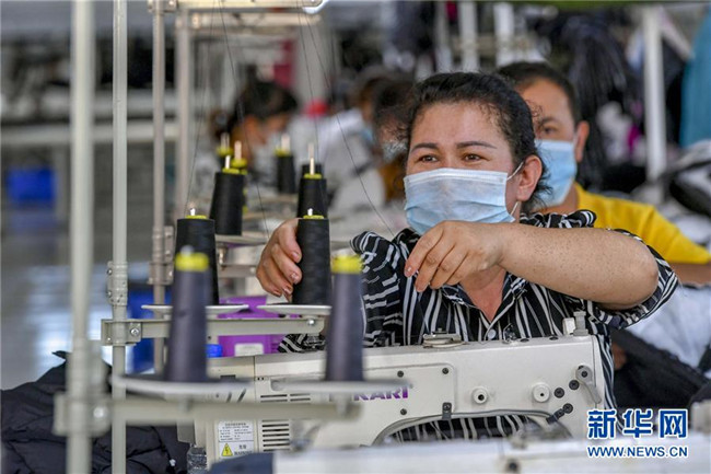 7月19日,在新疆喀什地區(qū)巴楚縣紡織服裝產(chǎn)業(yè)園一服裝企業(yè)車(chē)間,員工在生產(chǎn)線上忙碌。 新華社記者 馬鍇 攝