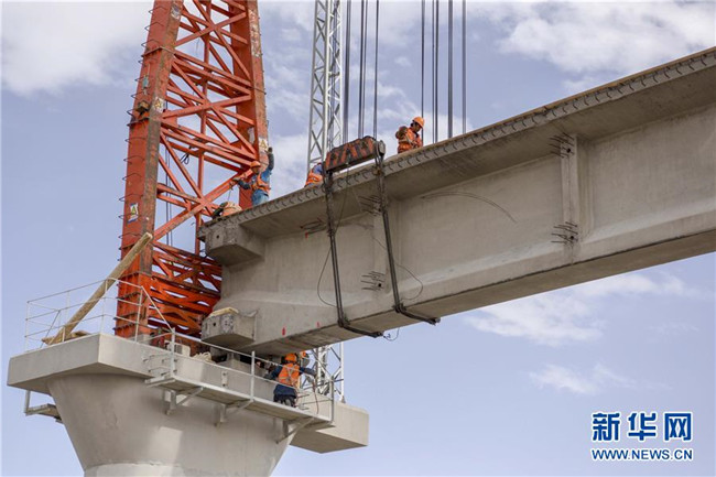 19日上午,位于新疆若羌縣依吞布拉克鎮(zhèn)的G315國(guó)道一號(hào)大橋上,隨著一根重達(dá)16噸的T梁穩(wěn)穩(wěn)落在橋墩上,新疆在建重大工程格(爾木)庫(kù)(爾勒)鐵路新疆段最后一座跨315國(guó)道的橋梁架設(shè)完工。