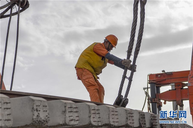 中鐵一局施工人員在格庫(kù)鐵路(青海格爾木至新疆庫(kù)爾勒)新疆段建設(shè)現(xiàn)場(chǎng)作業(yè)(7月18日攝)。 新華社記者 丁磊 攝