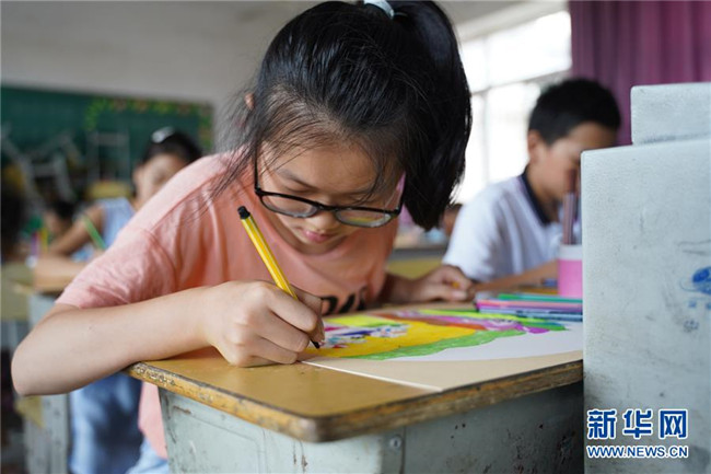 7月23日,在廬山市蛟塘鎮(zhèn)中心小學(xué)安置點(diǎn),小朋友在美術(shù)課上繪畫。新華社記者 張浩波 攝