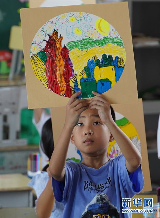 7月23日,在廬山市蛟塘鎮(zhèn)中心小學(xué)安置點(diǎn),一名小朋友展示自己的繪畫作品。新華社記者 張浩波 攝